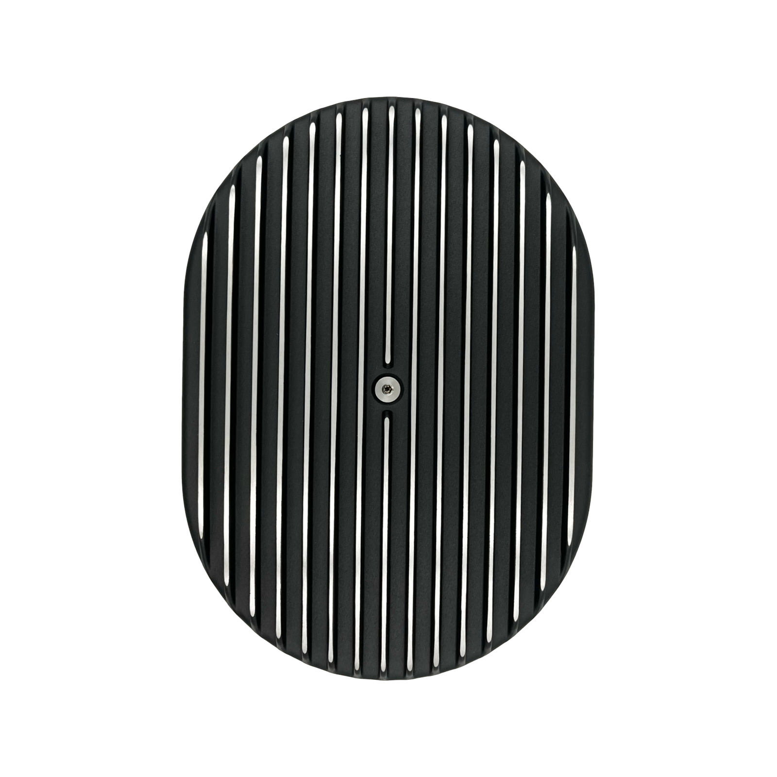 This oval air cleaner assembly features a full finned cast aluminium housing finished in satin black with an EDP coated surface for even coverage and corrosion resistance. The recessed base is designed to suit carburettors with a 5-1/8 inch neck, allowing a clean, low profile installation.