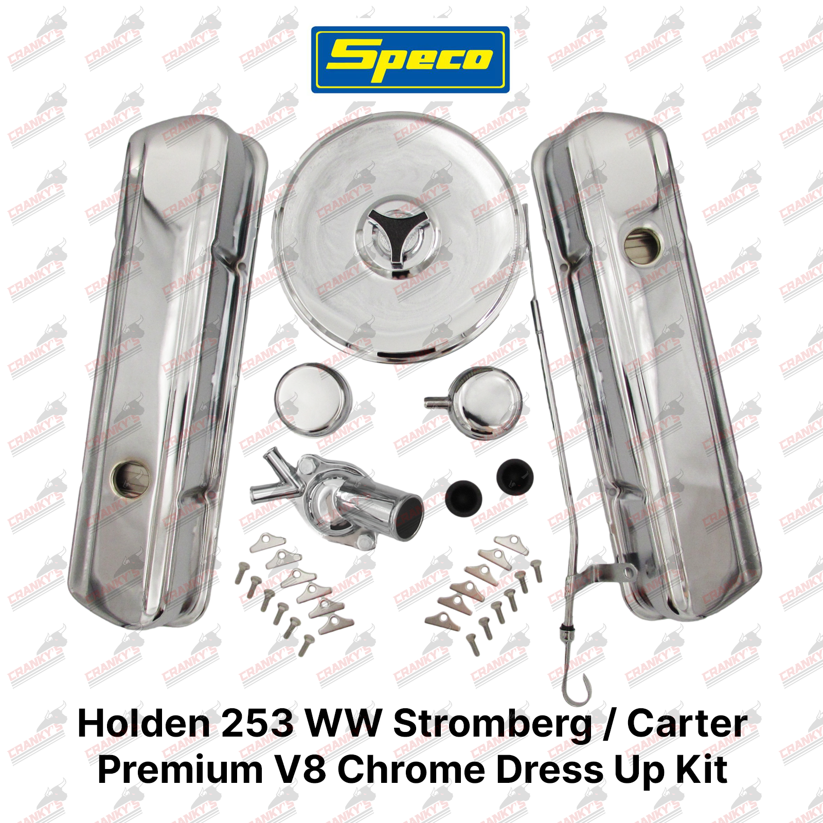 Bring classic style and durability to your Holden V8 with this comprehensive chrome dress up kit from Speco. Designed to fit Holden 253 carburetted red motors across HT, HG, HQ, HJ, HX, HZ, Torana (LH, LX), and VB Commodore. The included 9" Air Cleaner has a 2-5/8" neck to suit 2-Barrel WW Stromberg and Carter BBD carburettors from the era.